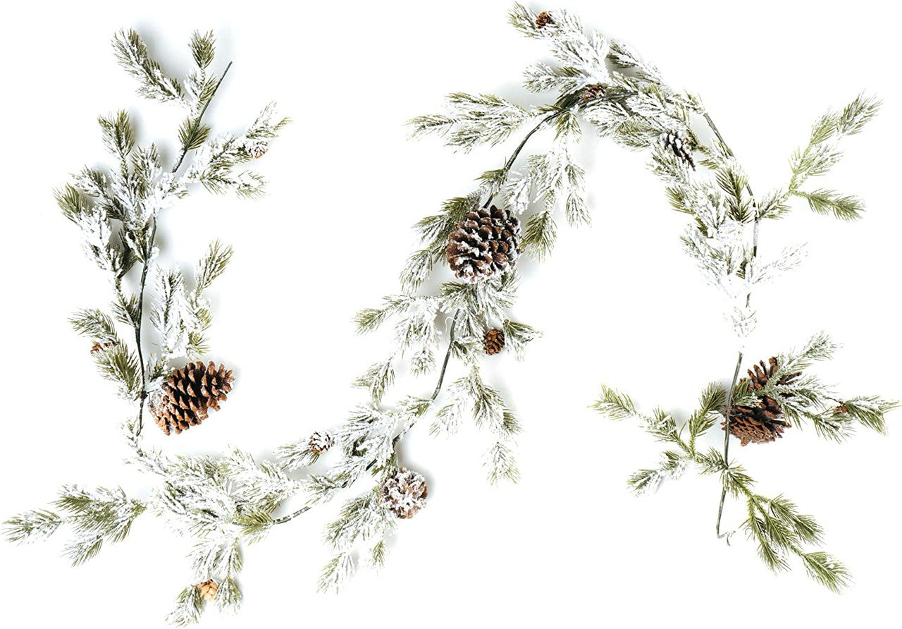 This artificial pine garland takes a realistic looking pine and lightly flocks it with snow. It includes assorted sizes of pine cones and has a wire base to help you have an easier time using it.